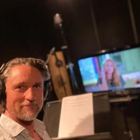 En la imagen se puede ver al actor en la cabina de grabación, doblando una escena. Se trata de una etapa de la post-producción para corregir algunas debilidades de audio en las tomas, o para agregar algunas líneas que en un principio no fueron grabadas, o que presentaban ruidos o estaban a un volumen bajo volumen.