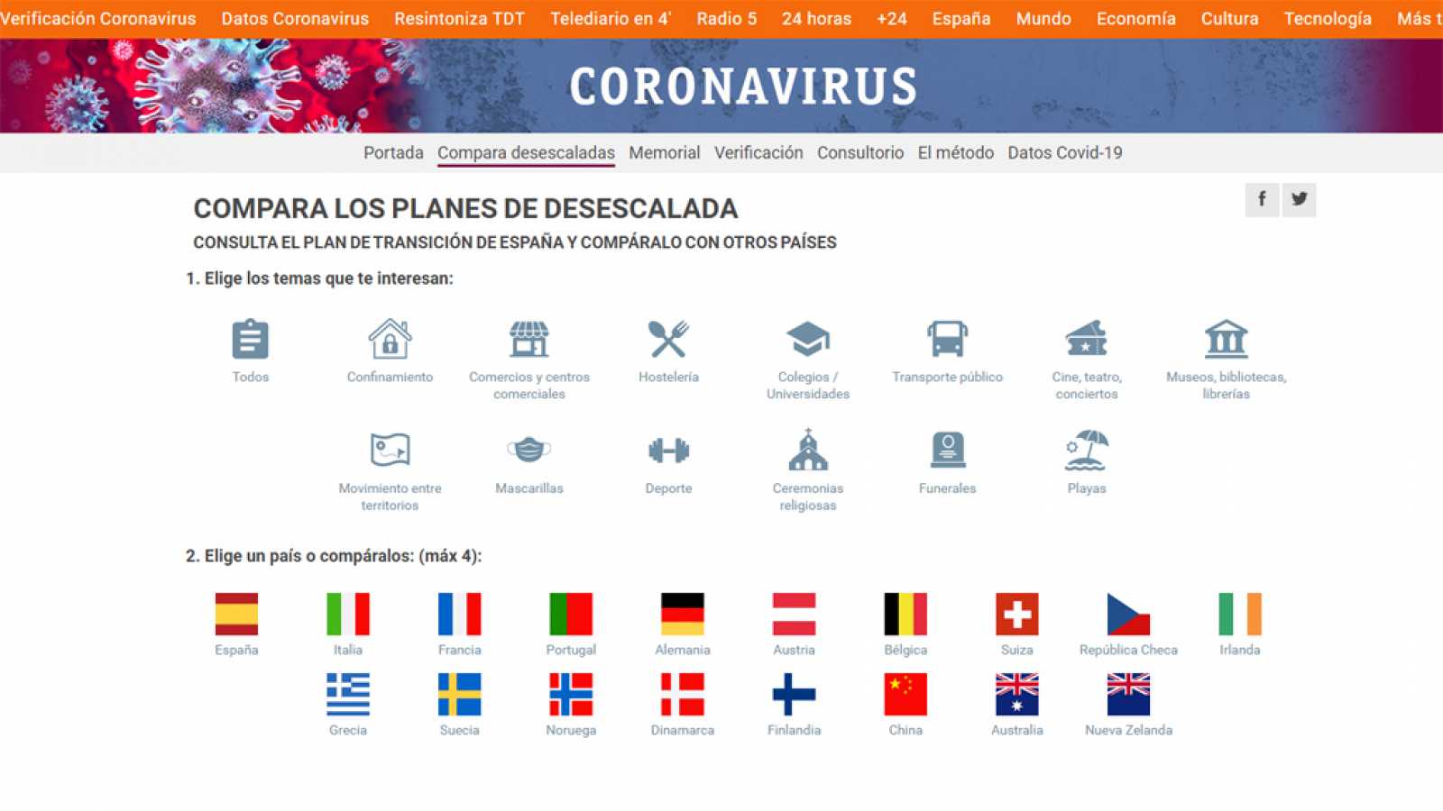 El comparador de RTVE.es sobre los planes de transición, que seguirá actualizándose en las próximas semanas, ofrece en este momento datos de España, Italia, Francia, Portugal, Alemania, Austria, Suiza, República Checa, Irlanda, Suecia, Noruega, Dinamarca, Bélgica, Grecia, Finlandia, China, Australia y Nueva Zelanda.